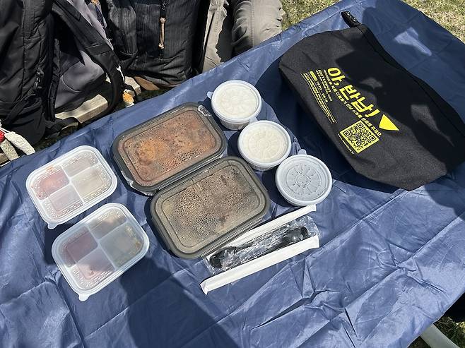 물론 보완할 점도 있었다. 예를 들어, 수저는 일회용기였다. 다회용기 배달에 수저도 추가될 수 있으면 좋겠다고 생각했다. 그리고 스테인리스 다회용기 크기가 다양하지 않기 때문일까? 메인 메뉴가 담긴 다회용기 2개와 일회용기 5개가 같이 가방에 담겨있었다. 거기다 거절했던 일회용 수저도 함께왔다. 아무래도 한강의 경우, 습관적으로 수저를 거절했다가 수저가 없어 민원을 넣는 경우가 있어 필수적으로 넣어준 것으로 보였다.