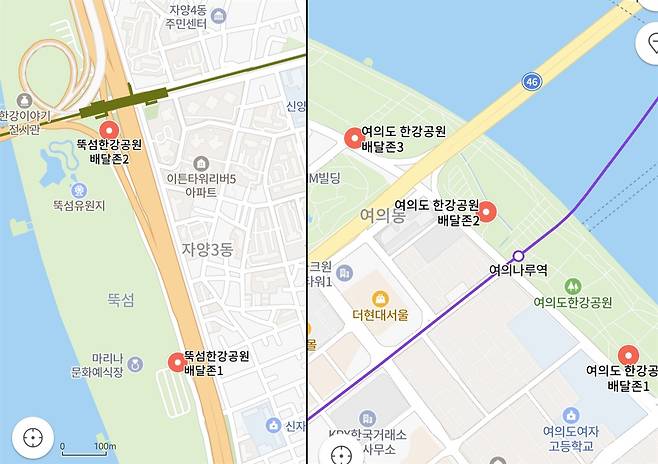 | ▲ 다회용기 수거함을 운영 중인 여의도 배달존 1,2,3과 뚝섬 배달존 1,2 |