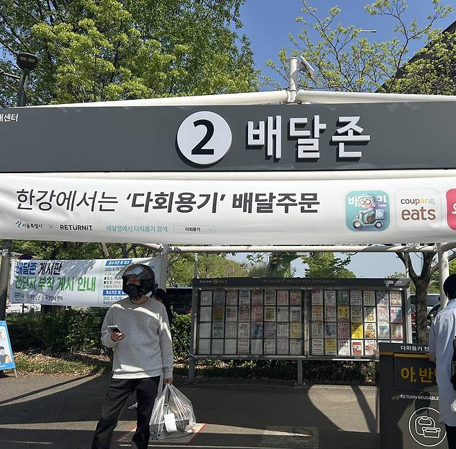 | ▲ 다회용기 수거함을 운영 중인 뚝섬 배달존 2의 다회용기 배달 안내 현수막. 그 아래에 일회용 배달용기를 든 배달노동자가 서있다. |