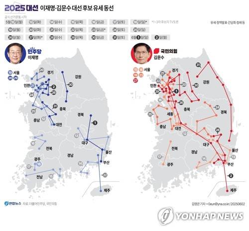 [그래픽] 21대 대선 이재명·김문수 대선 후보 유세 동선