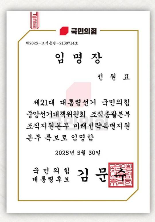 페이스북에 공개된 임명장은 국민의힘 김문수 대통령 후보 명의로 돼 있다. 전 위원장을 중앙선대위 조직총괄본부, 조직지원본부, 미래전략특별지원본부 특보로 임명한다는 내용이다.