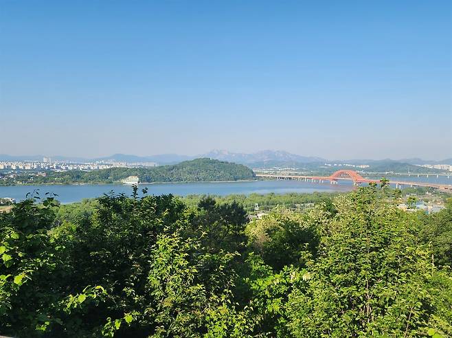 | ▲ 개화산전망대 개화산전망대에서 본 전경, 개화산과 함께 수도 서울의 관문처럼 마주 서서 서해로부터 들어오는 액운을 막아 주는 덕양산이 한강 건너편에 마주 보인다. |