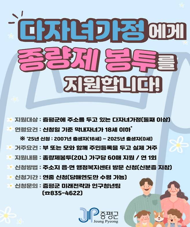 충북 증평군은 출생·양육 친화 환경을 조성하기 위해 다자녀가정을 대상으로 종량제봉투 60장을 지원한다고 2일 밝혔다.