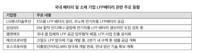 엘앤에프는 국내 주요 배터리셀 업체와 LFP 공급을 위한 업무협약을 체결하며 LFP 사업 진출을 공식화했다. 에코프로비엠도 경쟁업체들과 비교해 밀도가 높은 LFP 배터리 양극재 기술을 개발 중이다. 올해 2·4분기부터 고객들에게 수백 톤 규모의 샘플을 공급하겠다는 계획이다.