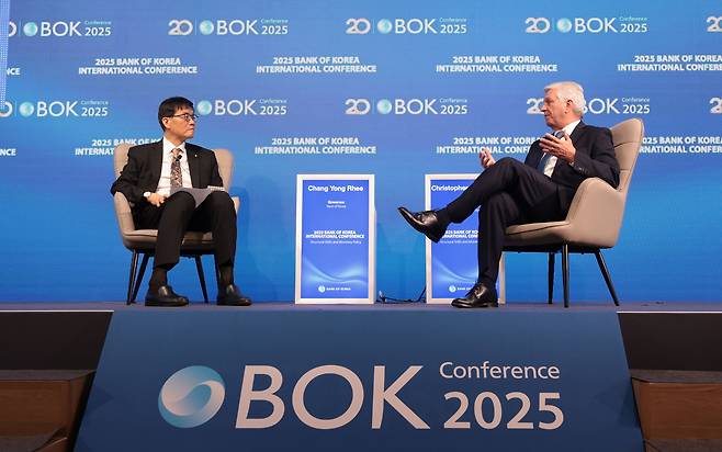 Bank of Korea Gov. Rhee Chang-yong (left) and Christopher Waller, a member of the US Federal Reserve Board of Governors, hold a policy dialogue during the 2025 BOK International Conference at the central bank's headquarters in Seoul on Monday. The two policymakers discussed the outlook for stablecoins and central bank digital currencies, and how such digital assets could reshape the global financial system.(Yonhap)