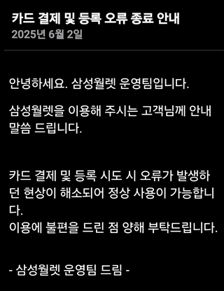 삼성페이를 운영하는 삼성전자는 즉각 복구에 나섰지만 원인을 찾는 데 상당한 시간이 소요됐다. 결국 오류 발생 3시간이 훌쩍 지난 오전 10시 30분께 삼성페이가 정상 작동했다. 삼성전자는 공지사항을 통해 “카드 결제 및 등록 시도 시 오류가 발생하던 현상이 해소돼 정상 사용이 가능하다”면서 “이용에 불편을 드린 점 양해 부탁드린다”고 안내했다.