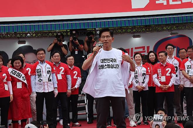 (부산=연합뉴스) 류영석 기자 = 국민의힘 김문수 대선 후보가 제21대 대통령선거 선거일을 하루 앞둔 2일 부산역에서 시민들에게 지지를 호소하고 있다. 2025.6.2 [공동취재]