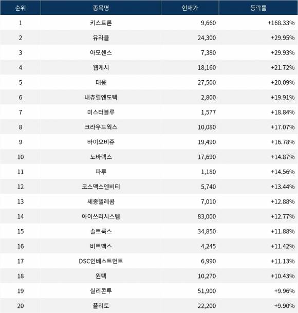 이어 상승률 2위 유라클(088340)은 주가가 29.95% 상한가를 기록하며 종가 24,300원에 상승 마감했다. 상승률 3위 아모센스(357580)의 주가는 7,380원으로 29.93% 상한가를 기록하며 강세를 보였다. 상승률 4위 웹케시(053580)는 21.72% 상승하며 18,160원에 마감했다. 상승률 5위 태웅(044490)은 20.09%의 상승세를 타고 종가 27,500원에 마감했다.