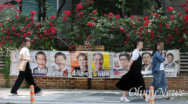 | ▲ 장미대선 사전투표 둘째 날 제21대 대통령선거 사전투표 둘째 날인 30일 오후 서울 마포구 한 거리에서 장미꽃 밑에 설치된 선거벽보 앞을 시민들이 걸어가고 있다. |