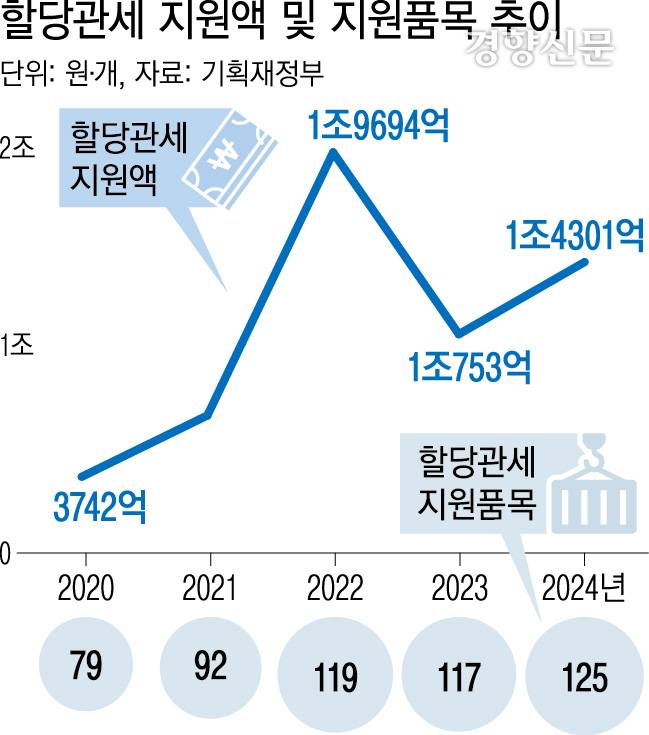 윤석열 정부 들어 할당관세 지원액은 큰 폭으로 늘었다. 2021년 6758억원이었던 할당관세 지원액은 2022년 1조9694억원으로 껑충 뛴 데 이어 2023년에도 1조원을 웃돌았다. 2021년 92개였던 할당관세 품목 수도 2022년 119개, 2023년 117개, 지난해에는 125개로 늘어나고 있다.