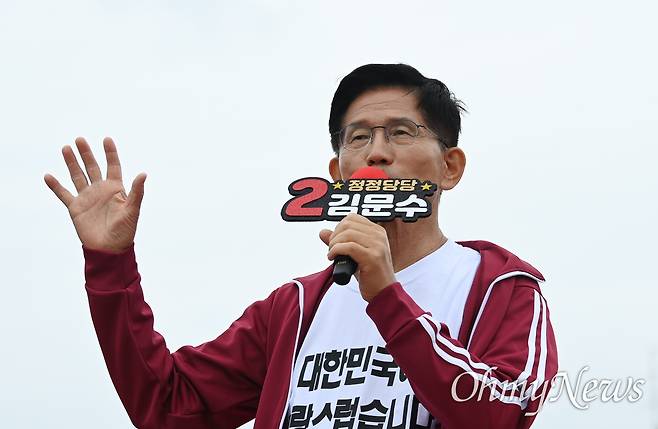 | ▲ 김문수 국민의힘 대선후보가 2일 오전 제주시 동문로터리 탐라문화광장에서 지지를 호소하고 있다. |