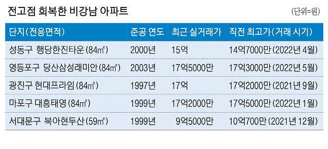 2일 부동산업계에 따르면 강남 아파트뿐 아니라 비강남 구축 아파트들도 2020~2021년 당시 전고점 가격을 속속 회복하고 있다.