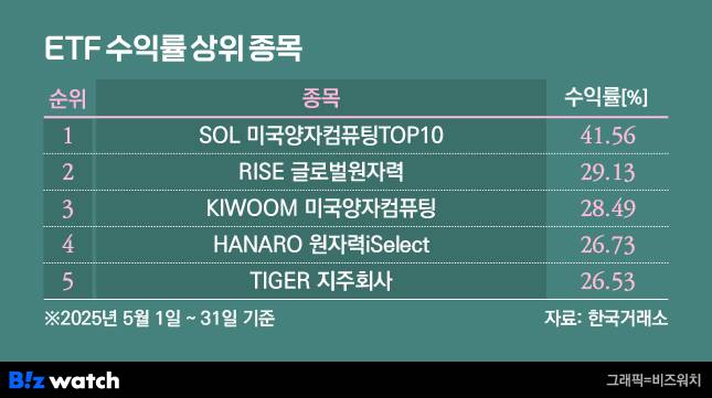 지난 5월 한 달간 ETF 수익률 1위는 신한자산운용의 SOL 미국양자컴퓨팅TOP10으로 41.56%를 기록했다. 미국 양자컴퓨터 기업의 1분기 실적이 시장 기대치를 웃돌면서 관련주 주가 상승한 영향이다.