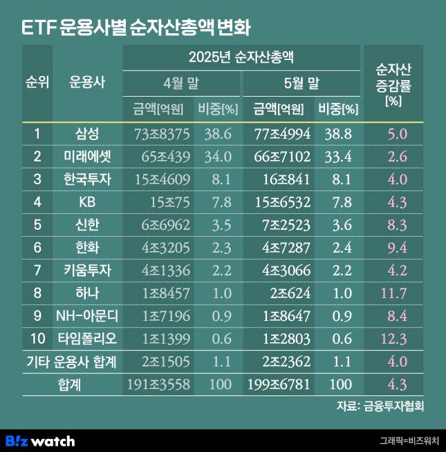한편 국내 ETF 순자산총액 합계가 199조6781억원(5월 29일 기준)을 기록하며 200조원 시대를 목전에 뒀다. 5월에는 ETF 상품을 내놓는 주요 10개 자산운용사 모두 역성장 없이 일제히 몸집을 키웠다. 6월초 순자산총액 200조원을 무난하게 돌파할 것으로 보인다.