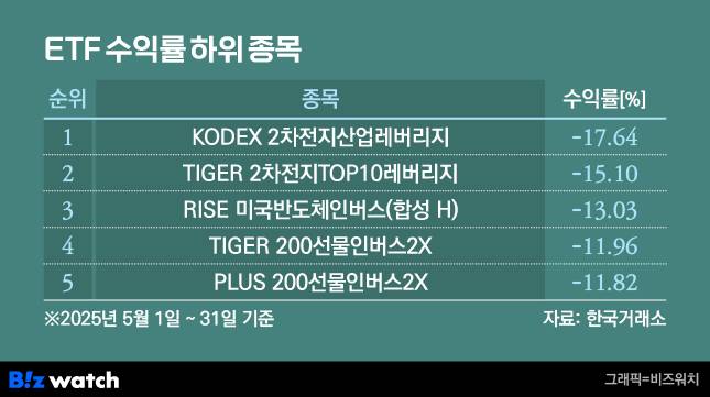 4월에 이어 5월에도 이차전지 ETF가 수익률 하위권을 차지했다. 삼성자산운용의 KODEX 2차전지산업레버리지 수익률은 -17.64%, TIGER 2차전지TOP10레버리지 수익률은 -15.10%로 집계됐다.