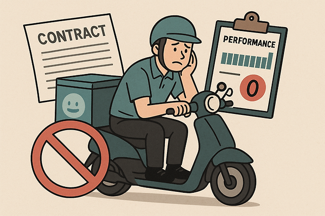 SLA(Service Level Agreement) 조항에 따라 건당 최대 600원의 수수료를 받을 수 있으며, 점수가 일정 점수 미만일 경우 건당 수수료는 '0원'이다. 배차 수락률이 일정 수준을 넘지 못할 경우 전체 점수는 0점으로 처리돼, 일한 만큼의 대가를 지급받지 못하는 구조다. 최근에는 일정 수준에 미달할 경우 계약 해지가 가능하다는 조건까지 추가됐다.