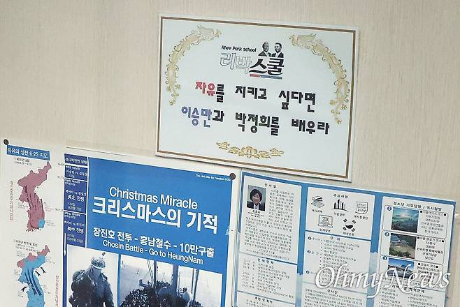 | ▲ 1일 오후 서울 종로구 한 빌딩의 사무실 입구에 ‘육사총구국동지회’ ‘전군구국동지연합회’ ‘리박스쿨’ ‘리박코리아’ ‘대한민국역사지킴이’ 간판이 붙어 있는 가운데, 사무실 입구에 '이승만과 박정희를 배우자'는 홍보물이 붙어 있다. |
