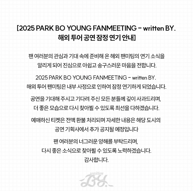 BH엔터테인먼트는 2일 "박보영의 팬미팅 투어 '리튼 바이'(written BY)의 해외 공연을 모두 잠정 연기하게 됐다"며 "사유는 내부 사정"이라고 밝혔다.