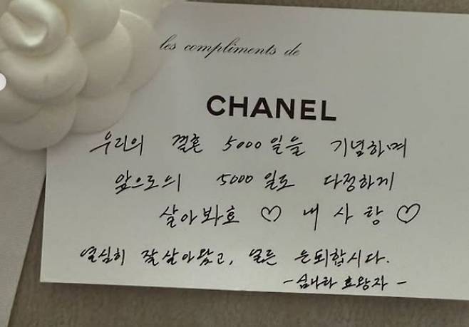 그는 김원효에게 받은 꽃다발과 손편지를 함께 공개하기도 했다. 손편지에는 ‘우리의 결혼 5000일을 기념하며 앞으로의 5000일도 다정하게 살아봐효. 내 사랑’이라고 적혀 있다. 김원효는 ‘열심히 잘 살아왔고, 얼른 은퇴합시다’라고 덧붙여 모두를 놀라게 했다.