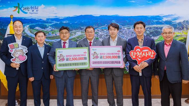 이영우 NH농협은행 부행장(투자상품·자산관리부문)과 백순흠 고려아연(주) 경영관리그룹장은 6월2일 합천군청을 찾아 고향사랑기부금 총 500만원을 기부하며 고향에 대한 애틋한 마음이 담긴 특별한 나눔의 시간을 가졌다.