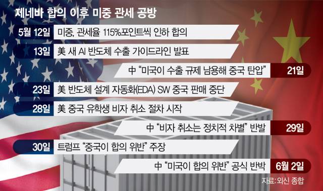 중국 상무부 대변인은 2일(이하 현지 시간) 홈페이지에 입장문을 올리고 “미국은 스위스 제네바 회담 이후에도 새로운 대(對)중국 차별적 제한 조치를 계속 내놓았다”며 “여기에는 인공지능(AI) 칩 수출통제 가이드 발표, 반도체설계자동화(EDA) 소프트웨어 판매 중단, 중국 유학생 비자 취소 등이 포함된다”고 지적했다. 이어 “미국은 일방적으로 끊임없이 새로운 마찰을 일으켜 양자 경제·무역 관계의 불확정성·불안정성을 키웠다”며 “스스로 반성하지도 않을 뿐 아니라 되레 중국이 합의를 위반한다고 비난하는데 이는 사실을 심각하게 벗어난 것이므로 중국은 단호히 거절한다”고 덧붙였다. 앞서 두 나라는 지난달 10~11일 제네바에서 만나 115%포인트의 관세를 서로 인하하기로 합의했다.