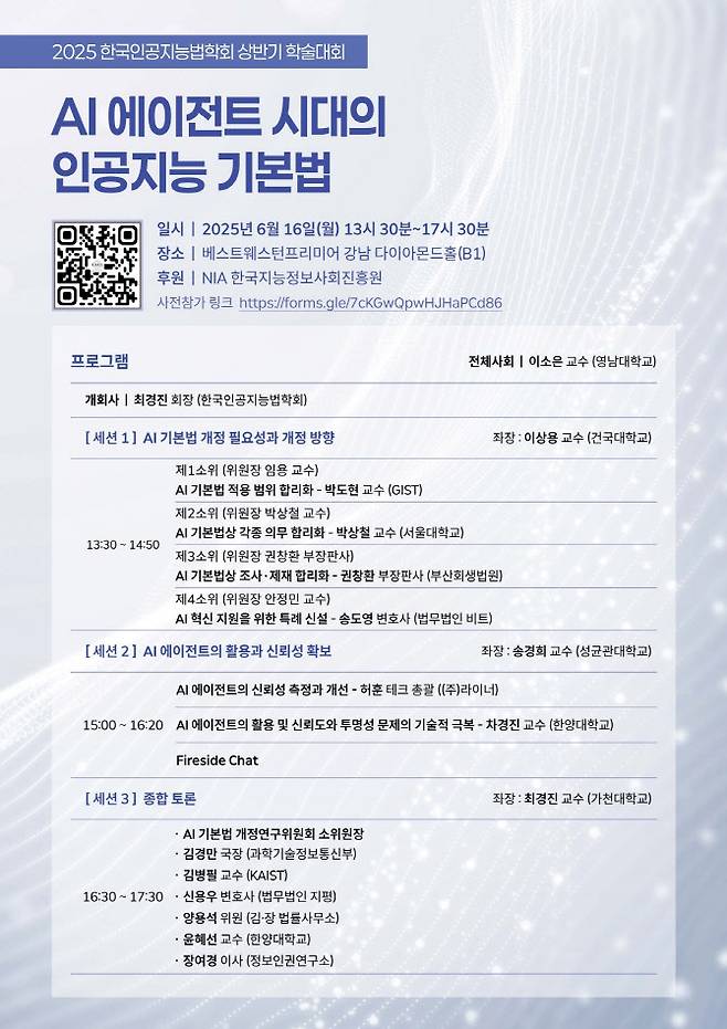 김경만 국장(과학기술정보통신부), 김병필 KAIST 교수, 신용우 변호사(법무법인 지평), 양용석 변호사(김·장 법률사무소), 윤혜선 한양대 교수, 장여경 정보인권연구소 이사 등이 참석해 ▲AI 기본법 개정 필요성 ▲법·기술적 쟁점 ▲AI 에이전트 활용의 법적 대응 방향을 논의한다.