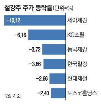 이날 한국거래소에 따르면 세아제강은 전 거래일보다 10.12% 하락한 15만1900원에 거래를 마쳤다. 세아제강은 미국 수출 비중이 30% 수준으로 추정된다. KG스틸(-6.16%), 동국제강(-3.72%), 한국철강(-3.66%), 포스코스틸리온(-4.08%), 세아베스틸지주(-2.99%), 현대제철(-2.66%), 포스코홀딩스(-2.4%) 등 주요 철강주는 물론 고려제강(0.57%), TCC스틸(-1.79%), 문배철강(-1.74%), 부국철강(-1.89%) 등 중소형 철강주도 일제히 약세를 보였다. 이와 함께 휴스틸(-5.94%), 동양철관(-5.59%) 등 강관(철로 만든 관) 관련 종목도 주가가 큰 폭으로 떨어졌다.