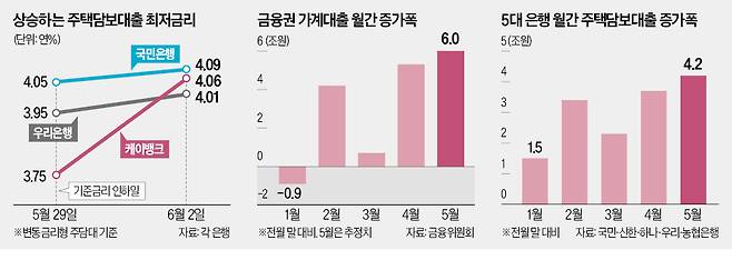 은행들은 가계대출 증가 속도가 가팔라 대출 수요를 억제하려면 금리를 올릴 수밖에 없다는 입장이다. 가계대출은 주담대를 중심으로 4월부터 급증 조짐을 보이고 있다. 금융당국에 따르면 금융권 전체 가계대출 잔액은 지난달에만 약 6조원 증가했을 것으로 추정된다. 이는 작년 10월(6조5000억원) 후 가장 큰 증가 폭이다.