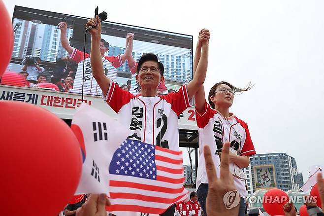 (대구=연합뉴스) 류영석 기자 = 국민의힘 김문수 대선 후보가 제21대 대통령선거 선거일을 하루 앞둔 2일 동대구역 광장에서 딸 동주 씨와 함께 지지를 호소하고 있다. 2025.6.2 [공동취재]