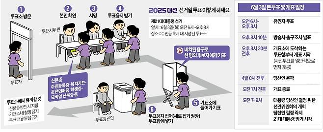 21대 대통령 선거가 3일 전국 1만4295개 투표소에서 치러진다. 전국 어느 투표소에서나 투표할 수 있었던 사전투표와 달리 이날 본투표는 자신에게 지정된 투표소에서만 투표할 수 있다. 투표 당일과 관련한 궁금증을 질의응답 방식으로 소개한다.