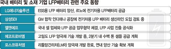 엘앤에프는 국내 주요 배터리셀 업체와 LFP 공급을 위한 업무협약을 체결하며 LFP 사업 진출을 공식화했다. 에코프로비엠도 경쟁업체들과 비교해 밀도가 높은 LFP 배터리 양극재 기술을 개발 중이다. 올해 2·4분기부터 고객들에게 수백 톤 규모의 샘플을 공급하겠다는 계획이다.