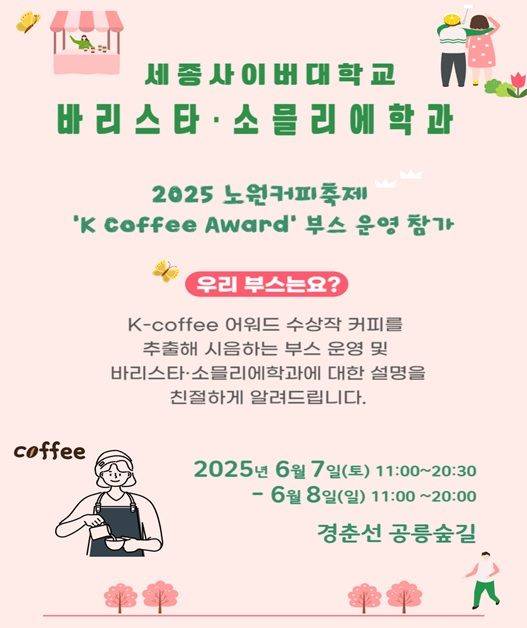 김정환 기자 = 세종사이버대학교(총장 신구) 바리스타·소믈리에학과가 7~8일 서울 노원구 지하철 7호선 공릉역 사거리와 경춘선 공릉숲길 일대에서 열리는 '2025 노원커피축제'에서 'K-커피 어워드'(K-Coffee Award) 부스를 운영한다.