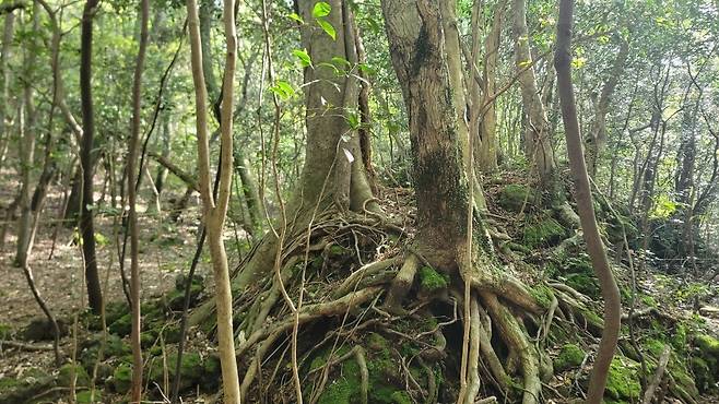 이 지역은 제주에서 가장 많은 삼나무가 분포되어 있다. 빼곡한 삼나무가 하늘을 덮고 있고, 그 삼나무 조림지를 지나더라도 다시 상록 활엽수인 붉가시나무와 구실잣나무와 굴거리나무 등이 빼곡하게 밀집하여 있고, 낙엽활엽수인 사어나무, 졸참나무, 때죽나무 등도 나머지 빈 공간을 채우고 있다. 이런 두터운 숲은 이 트레킹이 끝날 때까지 이어진다.