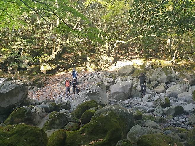 며칠 전 비가 좀 많이 왔다면 아마도 이 계곡을 건널 수 없을 게다. 한라산 어느 바위틈에서 시작된 하천은 수많은 지류가 합쳐지면서 대자연의 노여움 같은 굉음을 토해내며 이곳을 집어삼킬 것이다. 그 거센 물살을 보지 못했지만 들은 얘기에 의하면 범접할 수 없는 존재처럼 어떤 공포감을 느꼈다고 한다. 그런 기억을 상기시키며 나와 도반들은 지금은 시치미 딱 떼고 숨을 죽이고 있는 그 하천을 조심스럽게 건너기 시작했다.