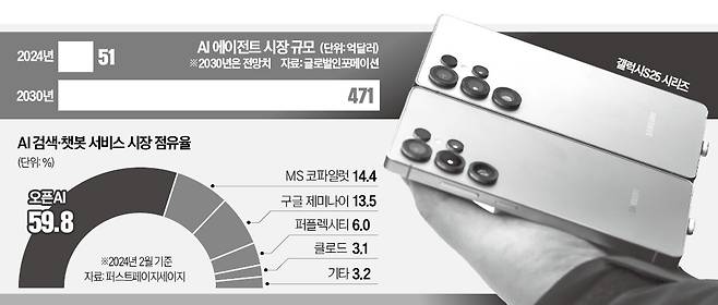 삼성전자는 지난해 1월 공개한 세계 첫 AI폰 갤럭시 S24부터 1년 뒤 내놓은 S25까지 구글의 제미나이를 기본 AI 어시스턴트로 넣었다. 삼성전자는 구글에서 제미나이가 적용된 기기당 일정 금액을 받고, 제미나이 앱에서 발생하는 광고 수익의 일부도 가져간다. 현재 구글을 경쟁법 위반 혐의로 조사 중인 미국 법무부는 “구글이 삼성전자에 내는 정확한 금액은 알려지지 않았지만 ‘막대한 수준’”이라고 밝혔다. 출하량 기준으로 글로벌 시장점유율 1위(19%) 삼성전자의 AI폰에 자사 서비스가 들어가면 향후 AI 시장 장악에 도움이 된다는 구글의 판단에 따른 것이다.