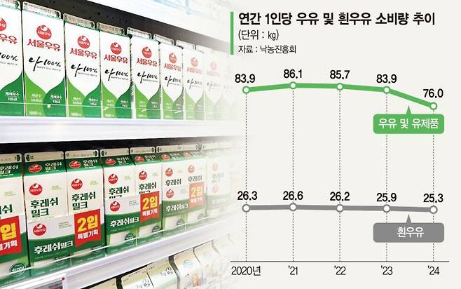 우리나라 1인당 연간 흰우유 소비량은 2020년 26.3㎏에서 정체와 감소를 반복하며 2024년에는 25.3㎏으로 줄었다. 가공유, 유제품 등을 포함한 우유 제품 전체 소비량도 이 기간 83.9㎏에서 76㎏으로 줄었다.