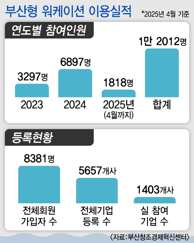 부산에서 일하고, 관광도 하는 일석이조 프로그램인 부산 워케이션도 인기가 높아지고 있다. 부산 워케이션은 2023년부터 부산시와 부산창조경제혁신센터가 주도하는 사업으로, 인구소멸 위험지역인 금정·영도·동·중·서구 등의 숙소에 머물면서 일을 하면 1박당 5만 원, 최대 10박 50만 원까지 지원해주는 프로그램이다. 부산 워케이션 거점센터 관계자는 “올해 3년 차에 접어들었는데 신청자가 늘고 있고 특히 최근에는 매주 70~80명이 이용한다”면서 “근무시간에는 워케이션 센터에서 일을 하고 업무 외 시간에는 관광을 즐길 수 있어 일석이조 효과가 있다”며 “요즘은 팀 전체가 와서 워크숍처럼 진행하기도 하고 프로젝트 하나를 끝내고 올라가기도 한다”고 말했다. 워케이션 참가자에게는 요트 등을 즐길 수 있는 관광바우처 5만 원 등도 제공된다.