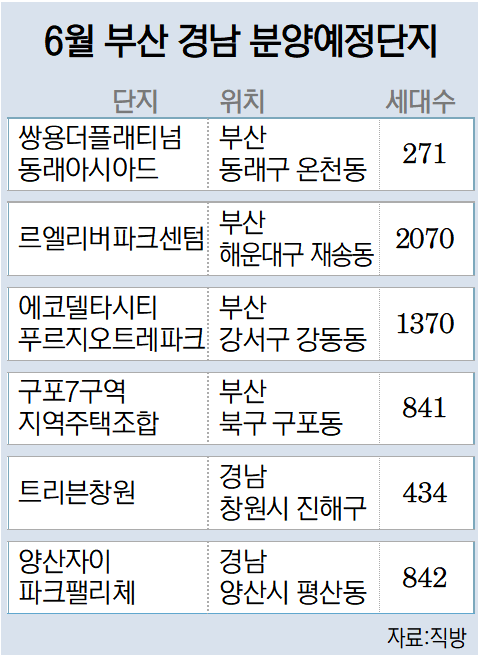 6월에는 전국에서 2만 6407세대의 아파트가 분양될 예정이다. 부산에서는 4552세대, 경남은 1276세대다. 울산은 계획된 물량이 없다.