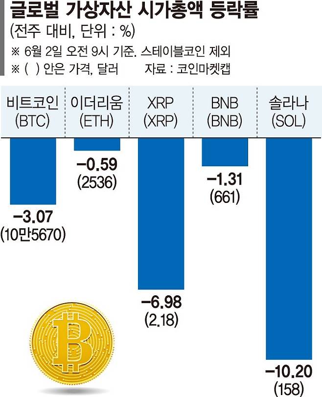 2일 글로벌 가상자산 정보 플랫폼 코인마켓캡에 따르면 오전 9시 기준 비트코인 가격은 10만5669달러로 전주 대비 3.07% 하락했다. XRP(리플)은 6.98% 하락한 2.18달러, 솔라나는 10.20% 급락한 158달러를 기록했다. 직전 상승랠리에서 상대적으로 배제됐던 이더리움은 0.59% 내린 2536달러로 낙폭이 크지 않았다.