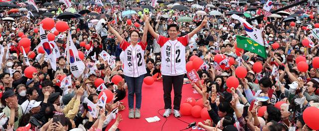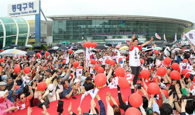 '21대 대통령 선서' 공식 선거운동 마지막 날이 2일 오후 국민의힘 김문수 대선 후보가 대구를 찾아 동대구역 광장에서 집중 유세를 펼치며 시민들에게지지를 호소하고 있다. 김진홍 기자 solmin@idaegu.com