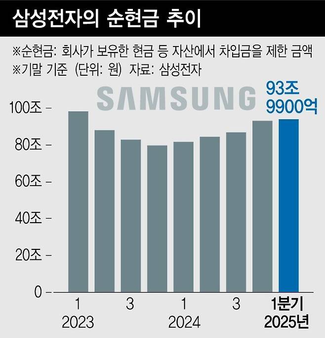 기술경쟁력 우려에 휩싸인 최근에도 삼성전자의 현금 사정은 양호하다는 평가가 많다. 올해 3월 말 연결 기준으로 회사가 보유한 순현금은 약 94조원이다. 반도체 혹한기가 덮쳤던 2023년말 79조원대까지 떨어진 이후 꾸준히 증가한 것이다. 순현금이란 회사의 현금 등 자산에서 차입금을 뺀 금액으로, 회사가 빚을 갚고 나서도 자유롭게 쓸 수 있는 현금 규모를 보여준다. 삼성전자 입장에서 새로 대출을 받을 필요가 큰 시점이라고 보기는 어렵다는 얘기다.