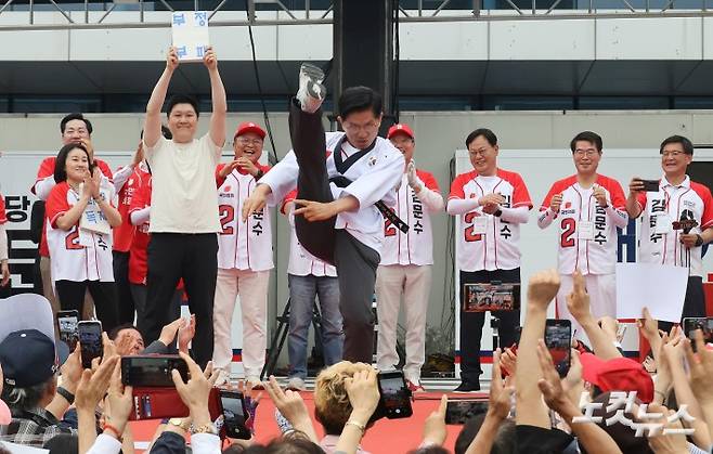 김문수 국민의힘 대선 후보가 2일 오후 대전 동구 대전역 서광장에서 열린 "울려라 함성, 들어라 승리의 메아리" 총괄거점유세에서 지지자로부터 태권도 도복을 선물 받은 뒤 발차기 실력을 선보이고 있다.