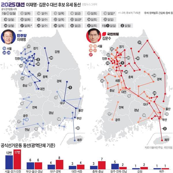 더불어민주당 이재명, 국민의힘 김문수 후보가 지난달 12일부터 2일까지 진행된 6·3 대선 공식선거운동 기간 유세를 가장 많이 펼친 곳은 서울·경기였다. 이어 부산·울산·경남의 PK와 대구·경북의 TK에도 공을 들였다.