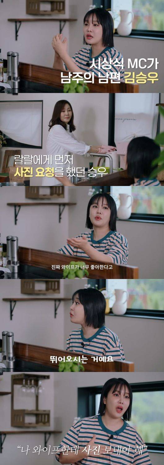 랄랄은 김남주가 요리를 하는 동안 김승우와 있었던 에피소드를 쏟아냈다. 랄랄은 “제가 작년에 상을 받았다. 남편(김승우) 분께서 MC를 보였다. 저는 솔직히 많은 분들이 저를 아실 거라고 생각을 못 한다. 랄랄에 대해 잘 모르실 거라 생각했는데 ‘진짜 와이프가 너무 좋아한다고 가기 전에 사진 한 번 찍어달라고 (하더라). 예의상 말씀하신 줄 알았다”라고 말했다.