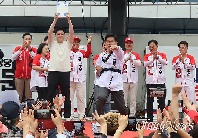 | ▲ 김문수 국민의힘 대선 후보가 2일 오후 대전 동구 대전역 서광장에서 열린 "울려라 함성, 들어라 승리의 메아리" 총괄거점유세에서 지지자로부터 태권도 도복을 선물 받은 뒤 태권도 실력을 선보이고 있다. |