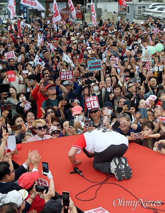 | ▲ 김문수 국민의힘 대선 후보가 2일 대전 동구 대전역 서광장에서 열린 유세에서 유권자들에게 지지를 호소하며 큰절하고 있다. |