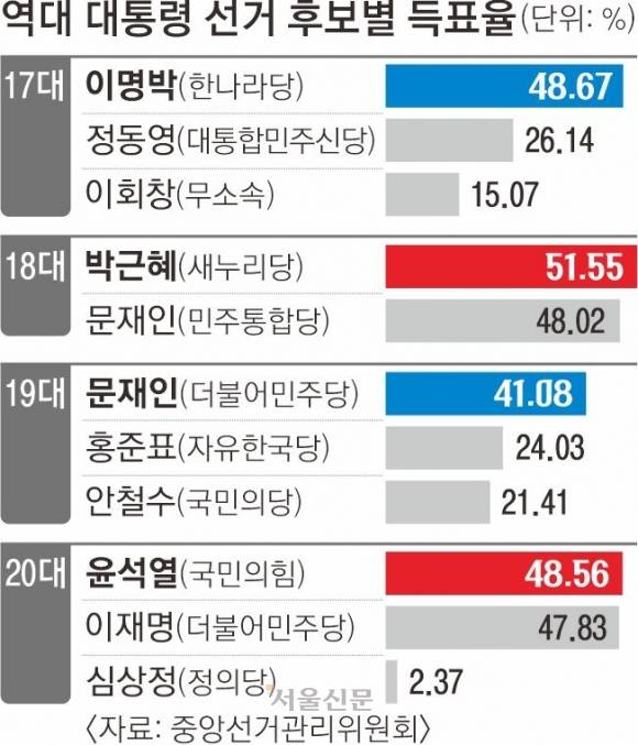 투표에 참여한 국민 절반 이상이 지지하는 ‘과반 득표’ 당선인이 나오느냐는 대선마다 주요 관전 포인트다. 1987년 대통령 직선제 개헌 이후 이를 달성한 대통령으로는 박 전 대통령이 유일하다. 당시 박근혜 새누리당 후보는 51.55%를 득표했다. 다만 18대 대선은 박 후보와 문재인 민주통합당 후보의 양자 대결로 각 진영의 ‘영끌’(영혼까지 끌어모은) 대결이라 과반 득표가 가능했다. 3자 구도로 치러지는 이번 대선에서 과반 득표 당선인이 나온다면 헌정사에 새 역사를 쓰게 된다.