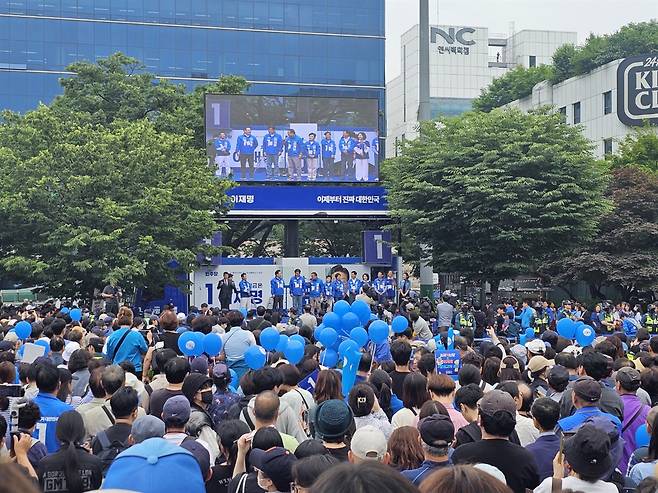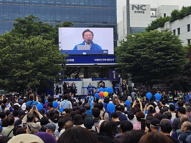 | ▲ 더불어민주당 이재명 대선 후보가 선거일을 하루 남긴 2일 야탑역 광장에서 유세를 진행했다. |