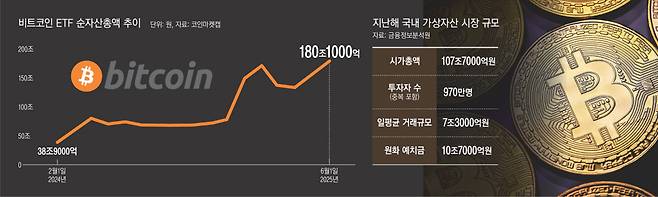실제로 지난해 가상자산 현물 ETF가 도입되면서 전 세계 가상자산 시장이 크게 성장했다. 도입 초반인 지난해 2월 초 약 39조원에 그쳤던 비트코인 ETF 순자산 총액은 지난 1일 기준 180조원으로 1년4개월 만에 5배 가까이로 불어났다. 기관을 비롯한 투자자들이 비트코인 ETF를 매입해 포트폴리오에 추가하면서다.