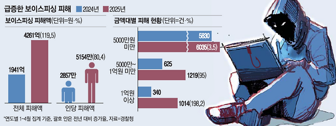 2일 경찰청에 따르면 지난 1~4월 보이스피싱 피해 사례는 8268건, 피해액은 4261억원으로 각각 집계됐다. 작년 같은 기간과 비교해 피해 사례는 약 22% 늘었고, 피해 금액은 120%가량 급증했다.